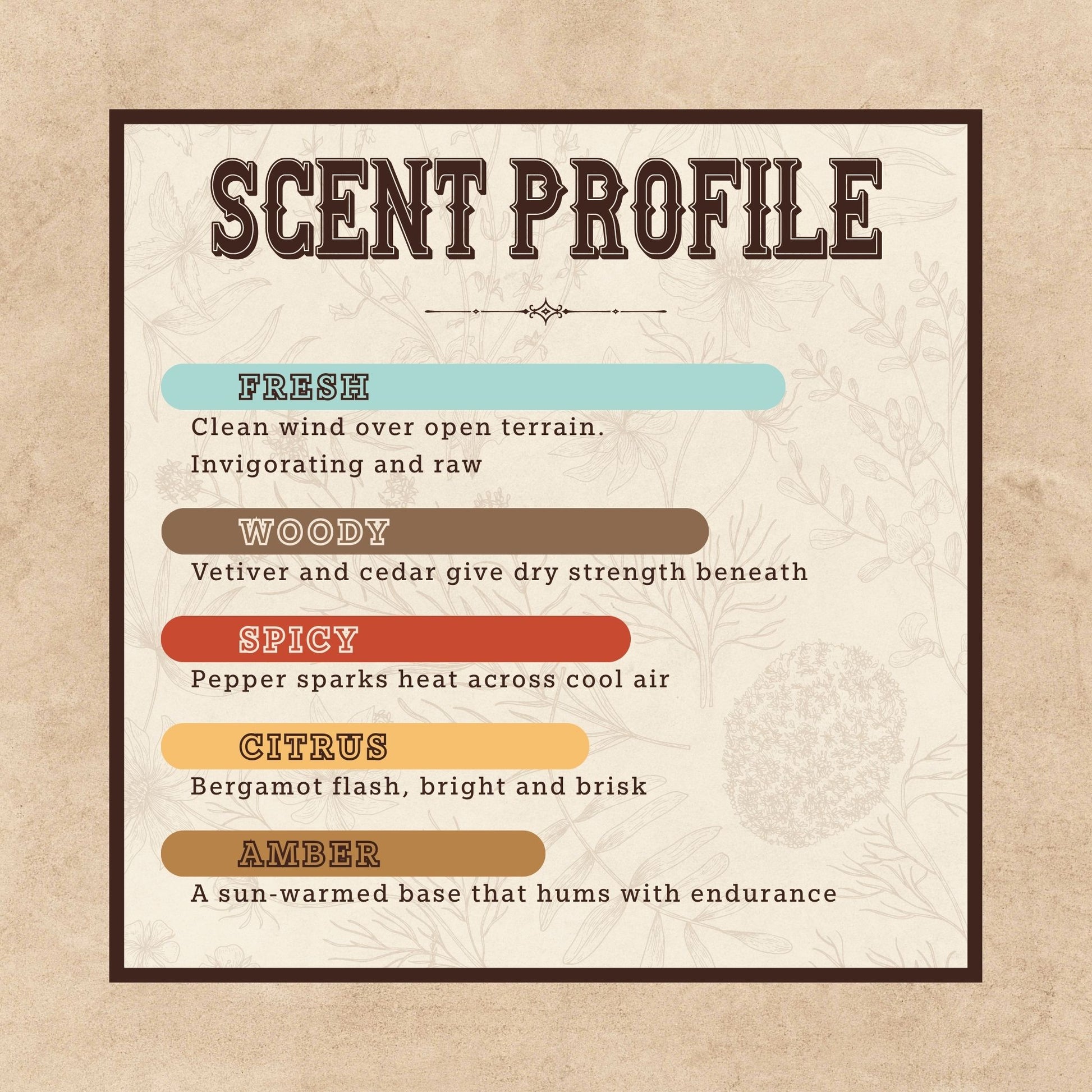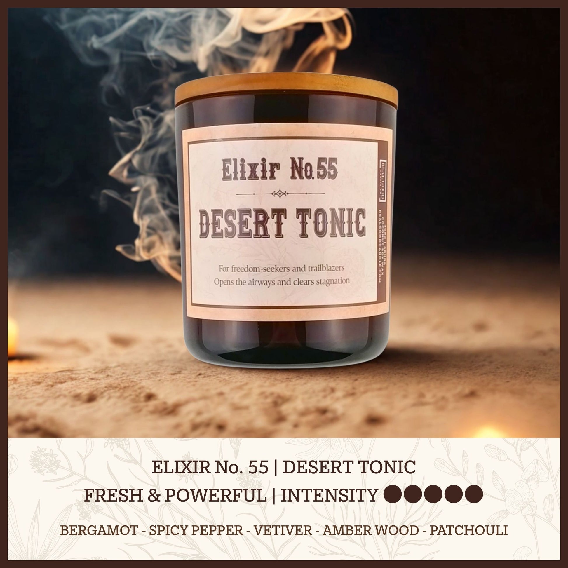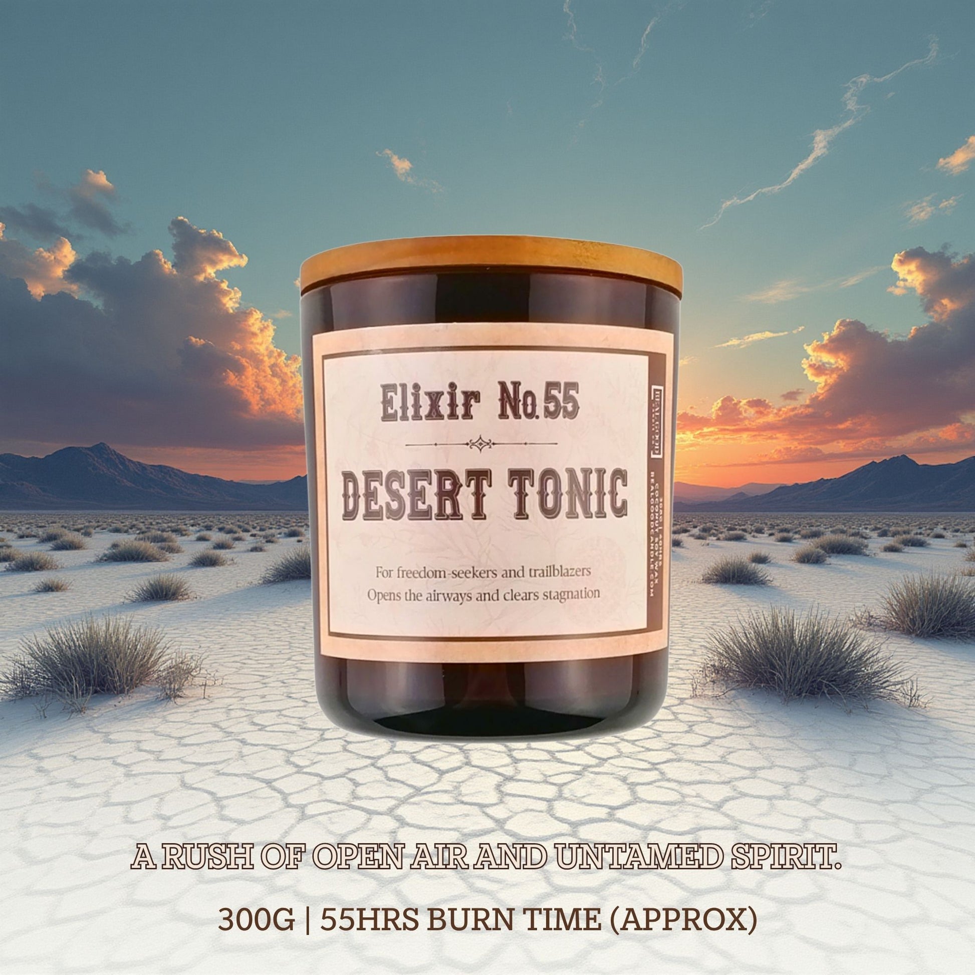 Desert Tonic is the pulse of the wild—intense, unrelenting, unforgettable. A clash of bergamot and spice opens like a strike of lightning across the desert sky, giving way to cool lavender, rugged herbs, and a horizon of smouldering woods. The result is strength made sensual, a fragrance that lingers long after the flame is gone.